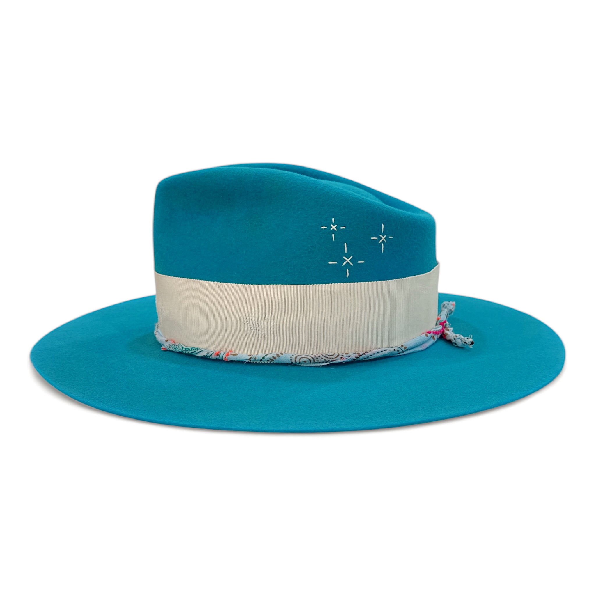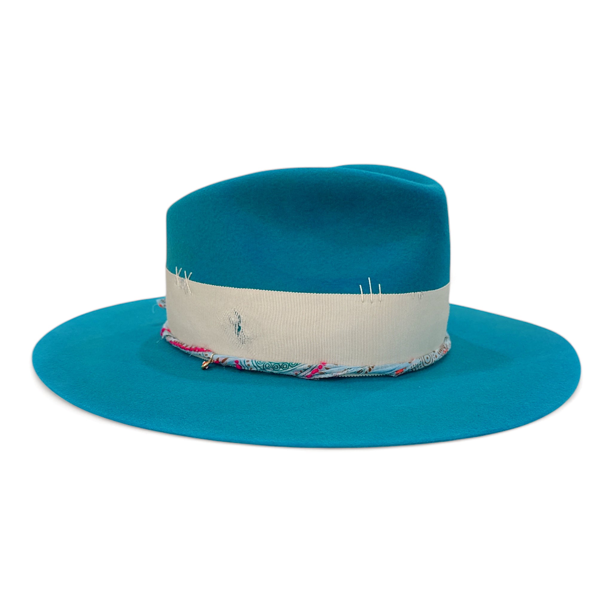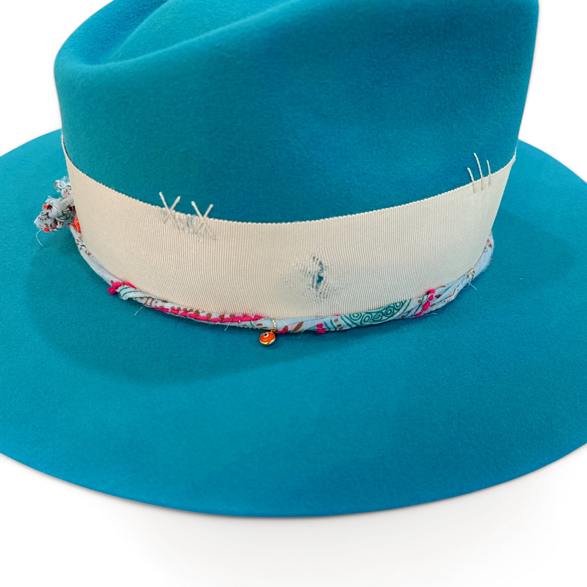 - 2" Grosgrain Distressed band + Cotton Multi print twisted wrap + Embroidery in cream + Evil eye charm