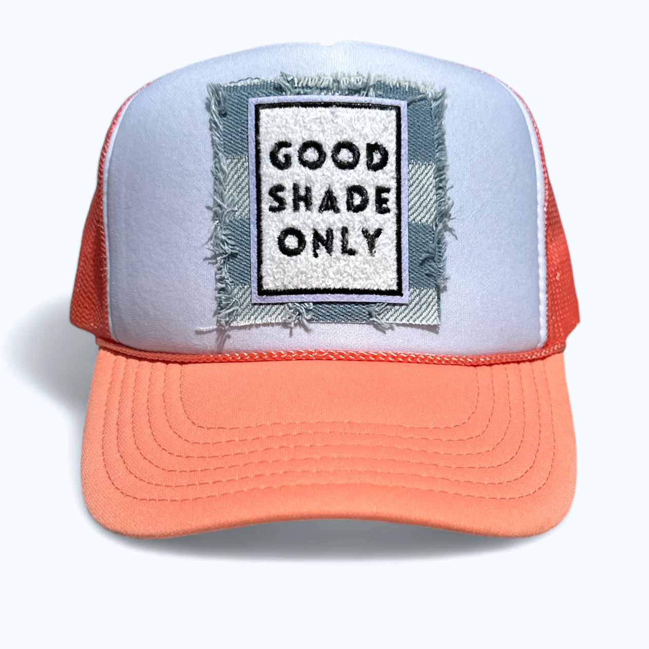 Coral & White trucker hat with embroidered chenille patch + Denim Gingham