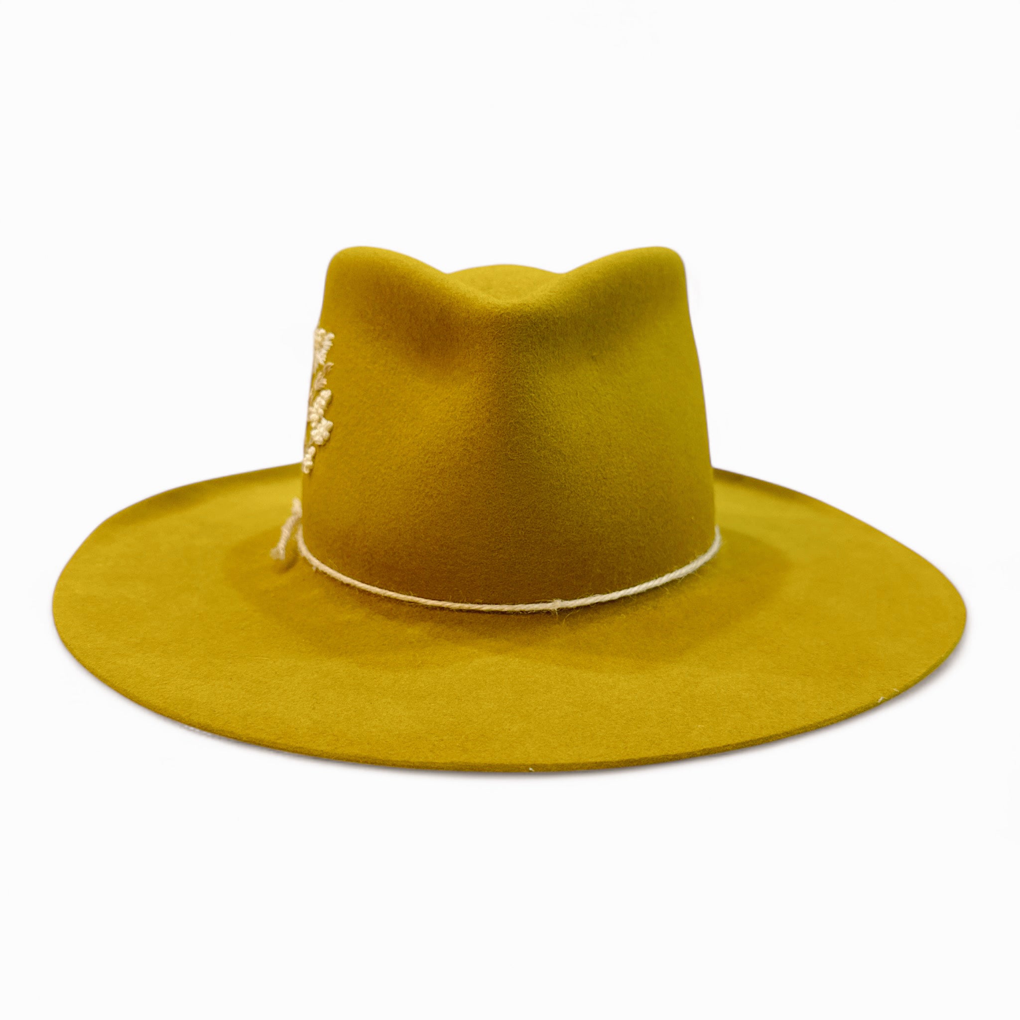 Mustard Western Weight Fur Felt + Hand Embroidered Flowers + String wrap